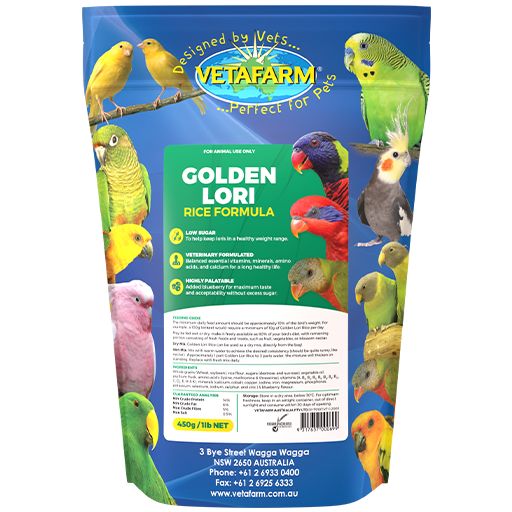 Golden Lori Rice Formula provides a low sugar diet with scientifically balanced nutrition to meet all of your Lori/Lorikeet’s nutritional needs in a highly palatable food. It has been designed to provide a diet high quality carbohydrates, protein, vitamins and minerals to deliver the essential nutrition required to maintain the health and wellbeing of your lovable larrikin!