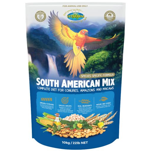 The pellets have been extruded for quicker absorption and uptake of nutrients, increased palatability and food safety. South American Mix is made from human grade ingredients grown in Australia with added fresh nuts for stronger palatability.